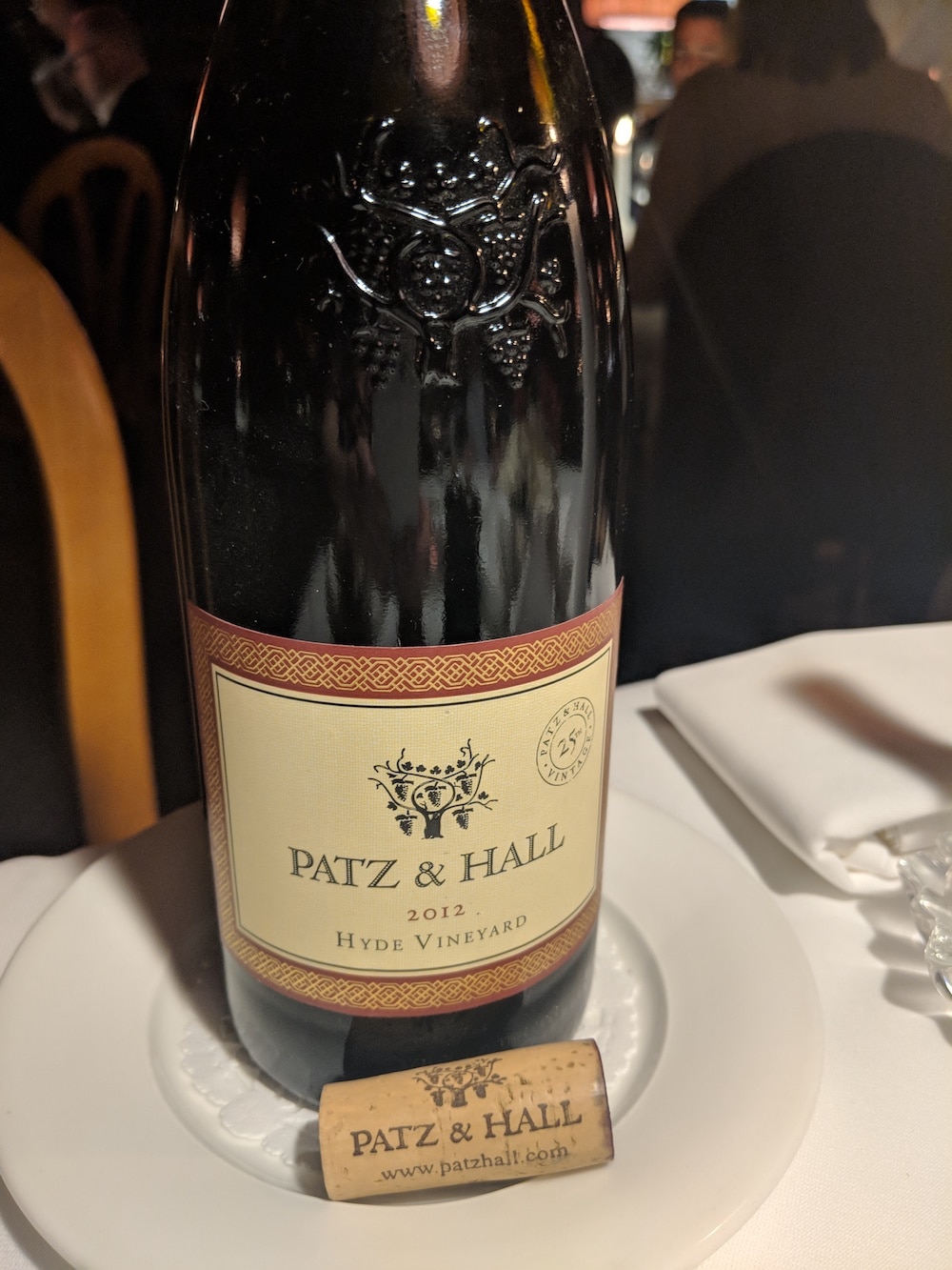 At this point in the meal, our wine was poured – a 2012 Patz Hall Pinot Noir. It had a clear red, purple colour characteristic of the grape, and a smooth, elegant taste. The only red to match roast turkey in my experience. (The wine went well with my last few bites of strudel as well…good timing!)