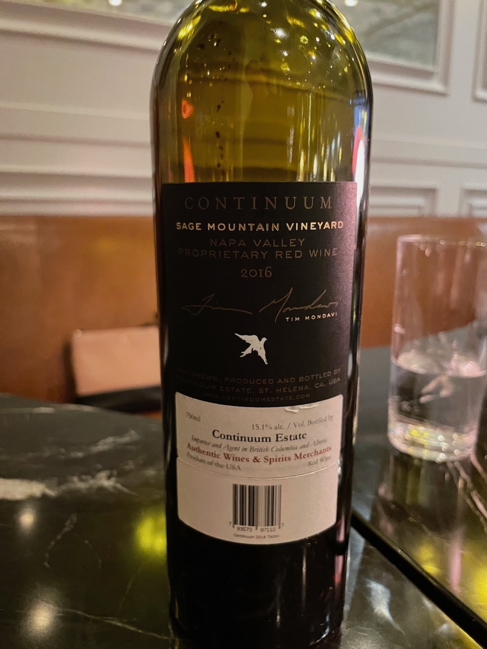 We enjoyed a bottle of the Continuum 2016 (Napa) – a Bordeaux blend that was at once rich-tasting with a deep, beautiful colour and deliciously floral scented. The showy decanter pictured above perfectly suited the wine and the art-deco decor of the dining room. All-around gorgeous wine and presentation.